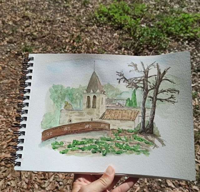 En Pere ens ha explicat l'origen de tot plegat i les intervencions que s'han realitzat en el temple romànic que contemplem, i, després d'esmorzar i veure l'exposició, hem fruït de les vistes del turó i del temple romànic, de la pau del lloc i de l'esplèndid dia, per deixar-nos la pell en el paper. Ja en veieu el resultat.