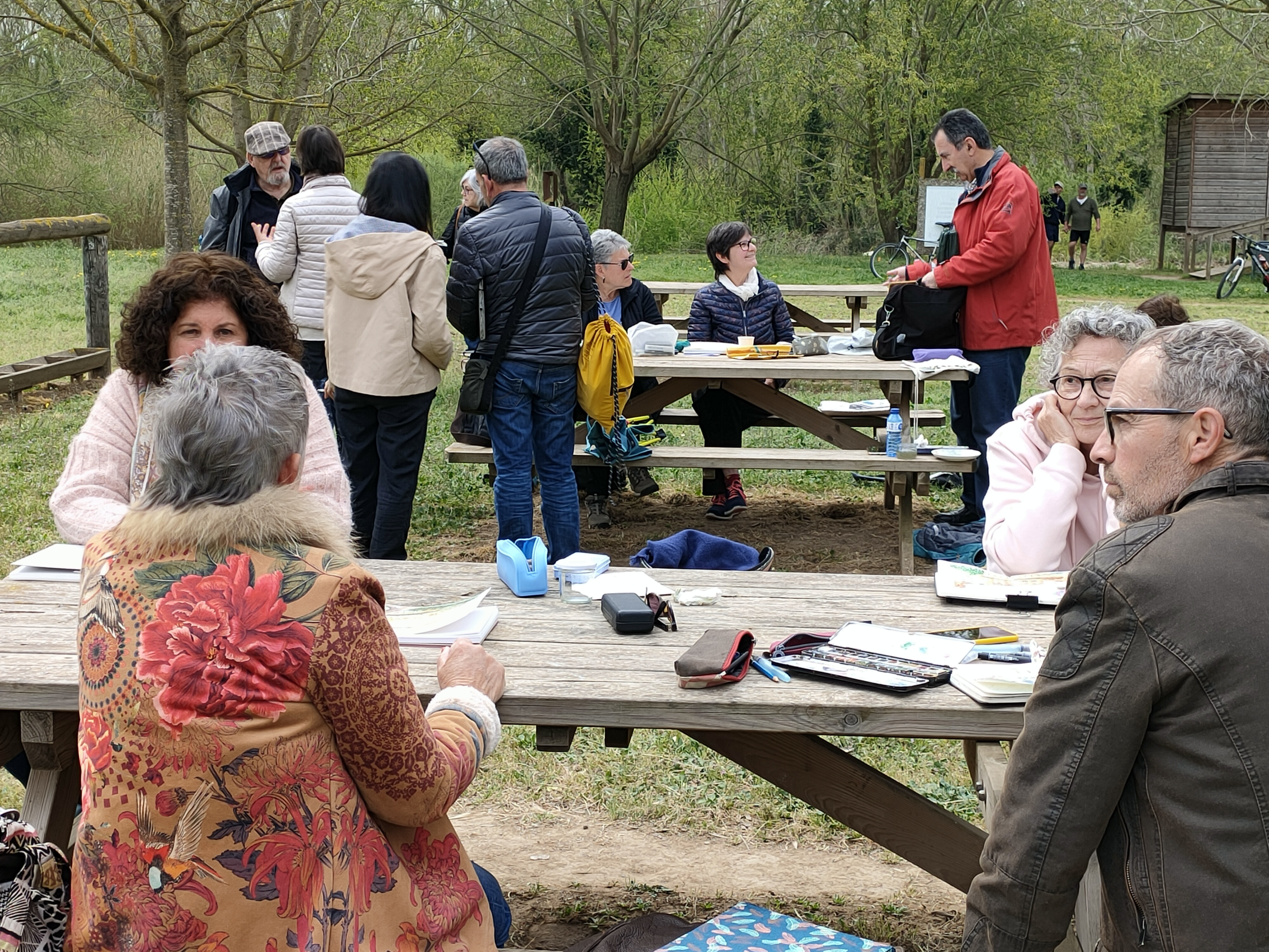 Al costat de la carretera entre el riu i el poble es veuen una filera de caiacs i un autobús vermell de dos pisos, que alguns hem aprofitat per dibuixar, d'altres les aigües amb els seus magnífics i difícils reflexos i una gran majoria l"skyline" del poble, molt ben asseguts amb taula inclosa.