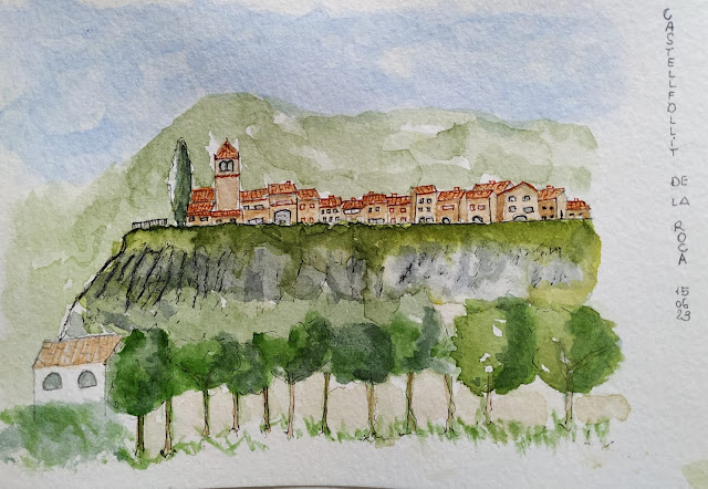 Aquest matí no podíem tenir millor escenari per dibuixar, hem anat a un dels pobles més petits de Catalunya, amb una extensió d'uns 0,73 km, Castellfollit de la Roca està enfilat a les cingleres de la roca.