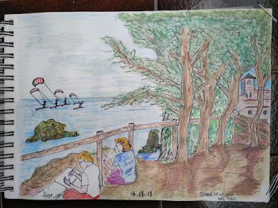 Una magnífica brisa marina ens portava la inspiració sota els arbres del turó. Quan dibuixes arbres ets al bosc amb ells. Els més agoserats i sense vertígen es van apropar al límit del penya-segat i van dibuixar sense por . Aquest risc afegit es va reflectir en els dibuixos que han estat alegres i amb colors molt vius. D’altres, menys agoserats , ens vam posar darrera la barana.