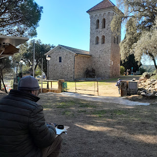 Avui dijous hem anat a dibuixar a Lloret. "Tocs de Natura" és un espai multifuncional creat per la Paquita Gruart i el Lluís Riera. Està ubicat al costat de l'ermita de les Alegries, a Lloret de Mar, i per això, veurem aquí molts dibuixos d'aquest edifici. Malgrat les baixes temperatures, un grup nombrós d'esketchers omplim les Alegries i el seu entorn, perquè, tot i que el dia és fred, llueix radiant i lluminós. A mig matí, la Paquita ens ofereix l'escalf d'una infusió de romaní, que recull ella mateixa, i amb el seu exquisit sabor al paladar, continuem dibuixant una mica més, fins al moment de compartir els quaderns. Ho gaudim amb un reconfortant aperitiu, servit pel Lluís, on un vinet francès posa la cirereta a la jornada. Els agraïm de tot cor, a la Paquita i al Lluís, la seva càlida acollida.